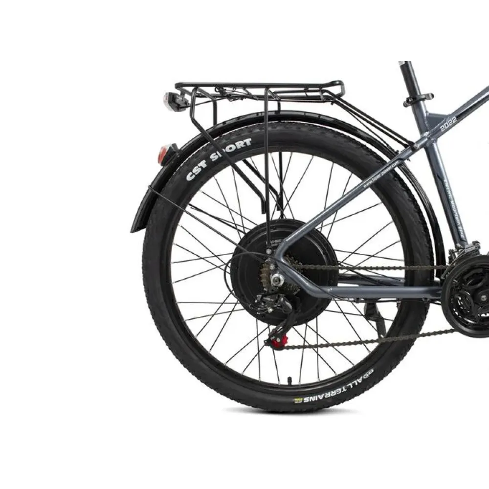 Электровелосипед имеет усиленную нескладную алюминиевую раму. Это сделано для того, чтобы увеличить максимальную грузоподъемность до 130 кг. Надежный электродвигатель мощностью 500 Вт питается от емкой батареи 12 Ач с напряжением 48 В. Быстро перемещаться по бездорожью на максимальной скорости 25 км/час позволяют усиленные подвески на амортизаторах. Заряда литий-ионного аккумулятора хватит на прохождение 45 км на одном заряде, а при необходимости пользователь может перейти на педальный режим.