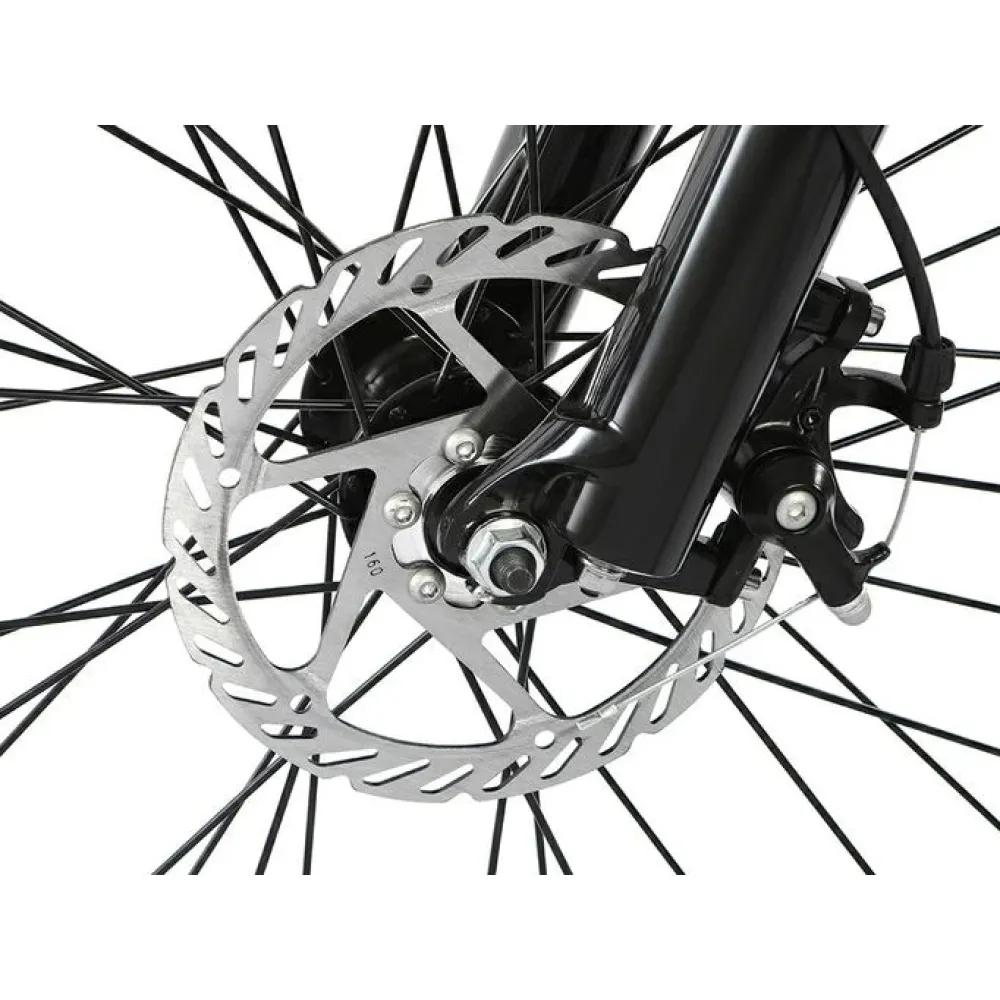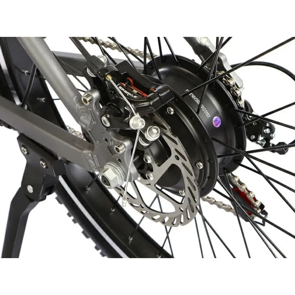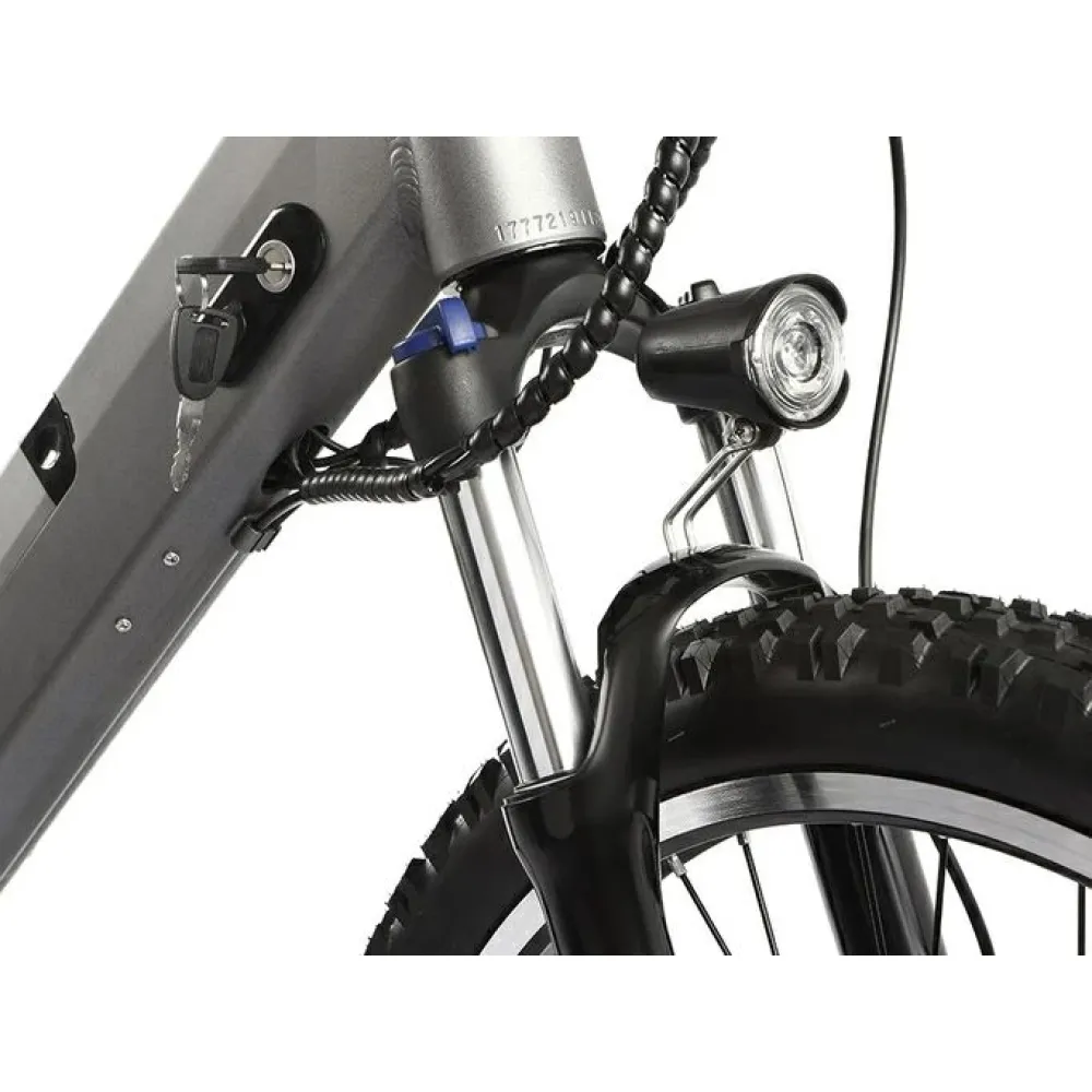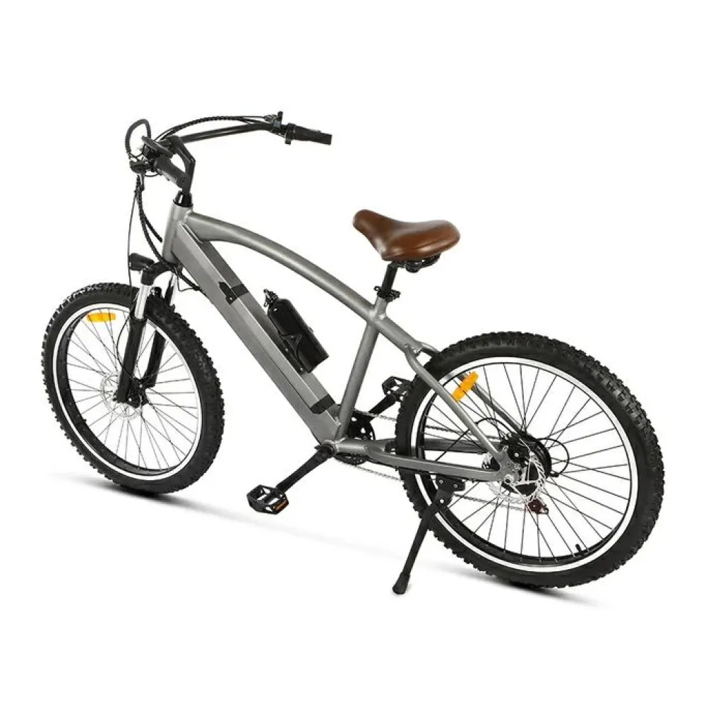 Модель изготовлена из инновационного ударопрочного алюминия. Рама – высока, цельная, с плавными изгибами удобная для длительного время провождения. Емкая батарея встроена в раму. При массе 23 кг электробайк рассчитан на грузоподъемность 120 кг. 26-дюймовые колеса без труда преодолевают по бездорожью, накатистые и устойчивые. Наличие евровилки минимизирует дискомфорт при передвижении по кочкам и ямам. Фирменная тормозная система гарантирует экстренное своевременное торможение.
