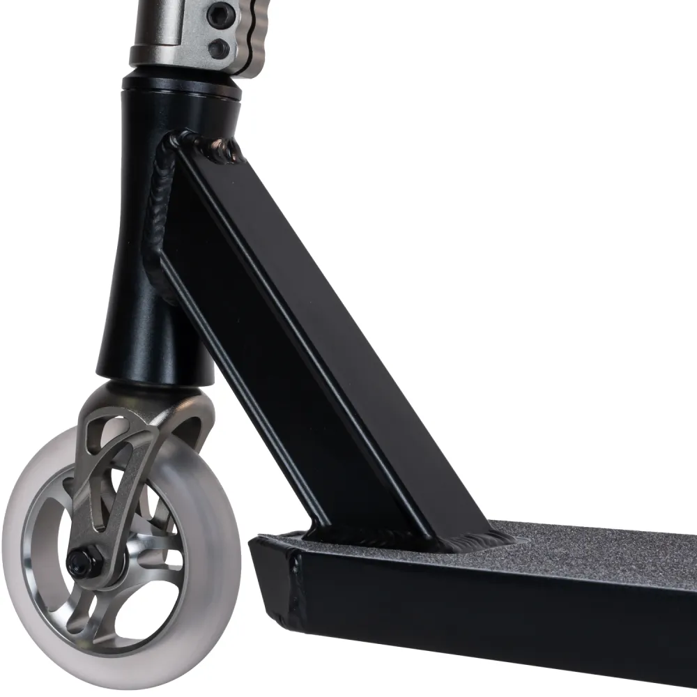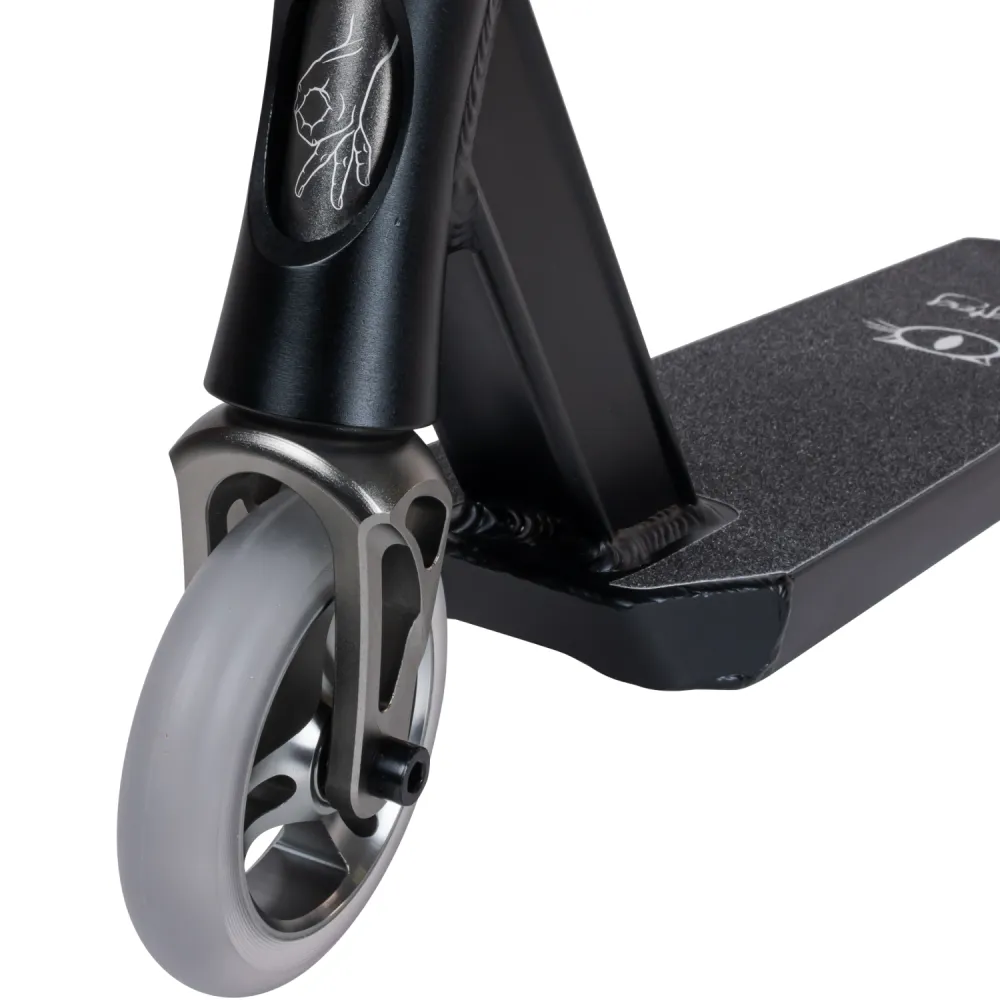 Колесная часть размером 110 мм изготовлена из мало стираемого полиуретана. Наличие алюминиевой фрезерованной вилки и фирменного заднего тормоза райдер может рассчитывать на качественный безопасный отскок.