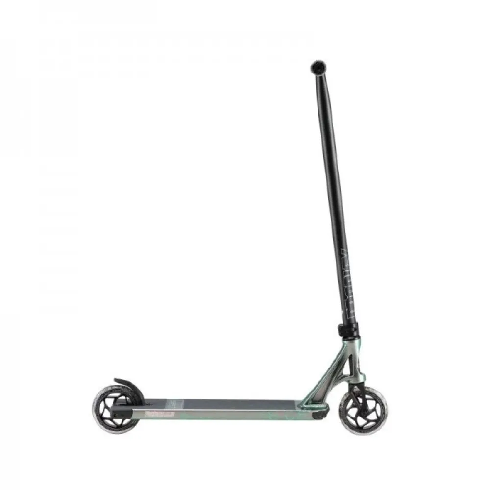 Конструкция самоката изготовлена из облегченного инновационного алюминия, благодаря которому вес составляет 4 кг. Прочность и надежность, устойчивость к механическим нагрузкам подтверждена многочисленными отзывами продвинутых трюкачей. Колесная часть изготовлена из качественного полиуретана, имеет размеры 120 мм с параметрами жесткости 86 А и инновационными подшипниками обещают максимальный накат, важный для трюкачества. Широкая дека покрыта брендовой среднезернистой шкуркой. Рулевая часть удобная по высоте, оборудована анатомическими удлиненными грипсами, гарантирующими максимальный хват. Крепится специальным хомутом с 2 болтами.